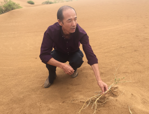 “我們每進(jìn)一步,沙丘就后退一步。現(xiàn)在我們看到的綠色帶,曾經(jīng)都是沙漠。”在治沙區(qū),每一種植物他都如數(shù)家珍。他告訴記者,自己一輩子都在跟沙漠打交道,在探索中他發(fā)明了“便捷式沙漠造林器”。使用這種工具只需腳一踩就能輕松完成種植,以前每人每天種植200株,現(xiàn)在提升為400株,還保持了種子所需的水分。