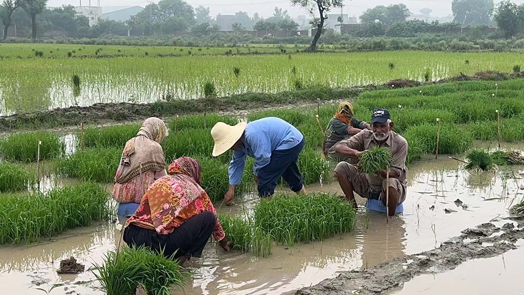 龍春久教授(中)與巴基斯坦當(dāng)?shù)剞r(nóng)民在拉合爾隆平南亞種子研發(fā)中心試驗(yàn)田里忙碌著。(人民網(wǎng)記者 周晶攝)